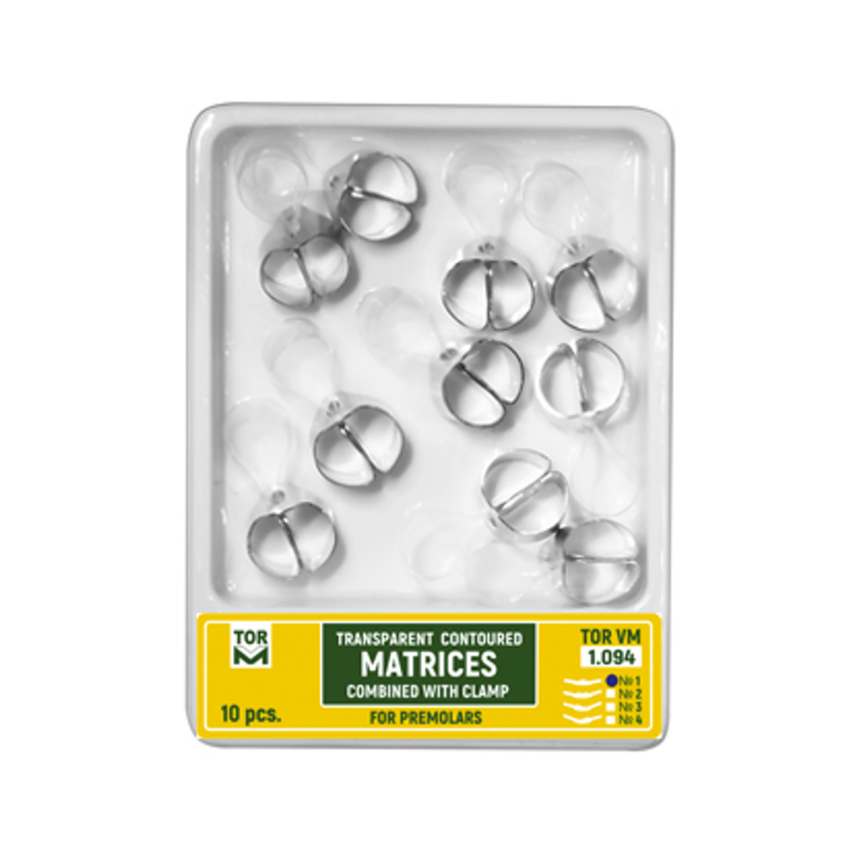 Utántöltő No.1  10 darabos kiszerelésben premoláris fogakhoz. A szorítógyűrűs matricák helytakarékosan oldják meg a matrica rögzítését, miközben rendelkeznek a szekcionált matricák domborúságával és a körkörös matricák jó rögzíthetőségével. A matricák átlátszóak így jól átpolimerizálhatók a tömőanyagok.