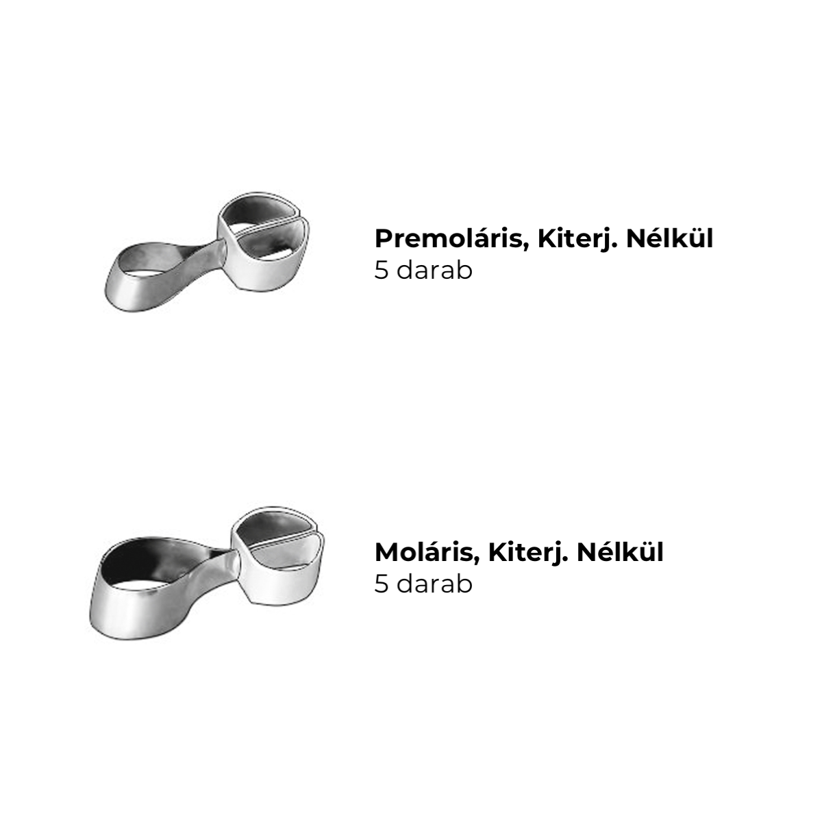 Domborított, szorítógyűrűs fémmatricakészlet 10 darabos, premolárisokhoz és molárisokhoz gingivális kiterjesztés nélkül.