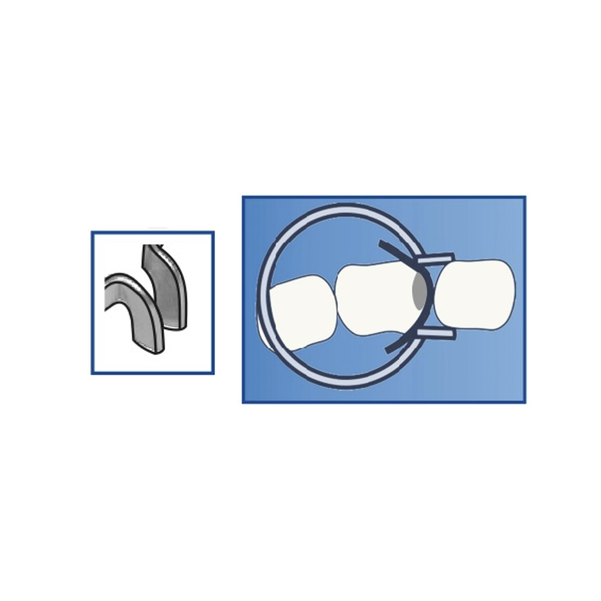 Rögzítő gyűrű, lapos szárú, szekcionált matricához. A rögzítő gyűrűk az interproximális területen megszorítják a szekcionált matricákat. Ezzel adaptálják a fogak felszínéhez. A gyűrűk függőleges szára alul ki van peremezve, ezáltal – az interdentális ékekbe akaszkodva – kiválóan rögzülnek, nem hajlamosak a lepattanásra.