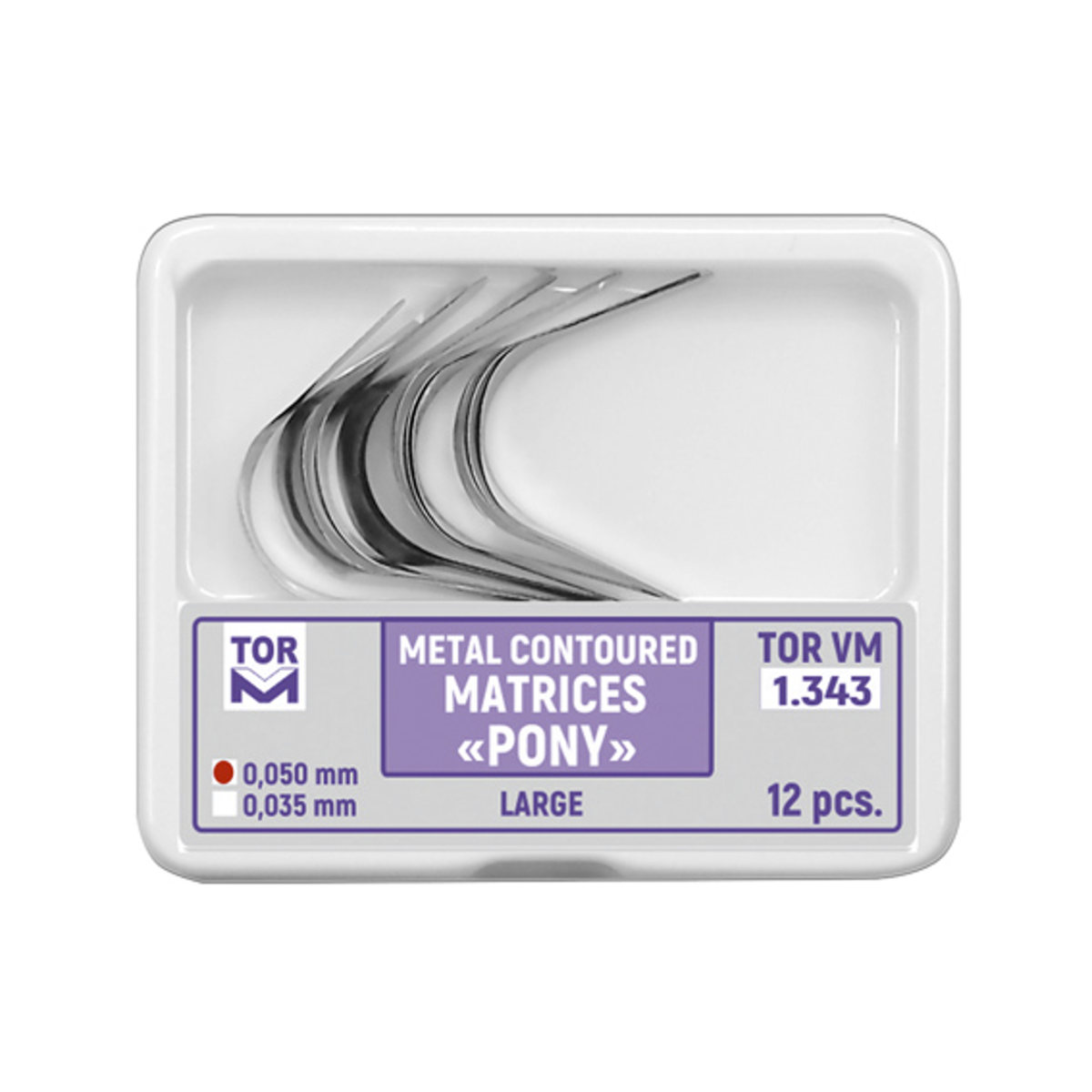 A domborított fém pony matricák 50 mikron vastagságú, nagy  hosszított szekcionált matrica variációk 12 darabos kiszerelésben. Hosszabb szélük miatt a tartógyűrű vagy csipesz nem a fogközben, hanem a fog közepén tartja meg őket. A hosszított szekcionált matrica variáns segítségével akár a csücsökhiányokat is pótolni tudja, mivel a rögzítő csipesz vagy gyűrű nem a fogközben helyezkedik el, így nem nyomja be a matricát sem. A domborítás miatt erős kontaktpontot alakíthatunk ki. Szélesebb fogközökben is sikerrel használható feszes kontaktpont kialakítására.