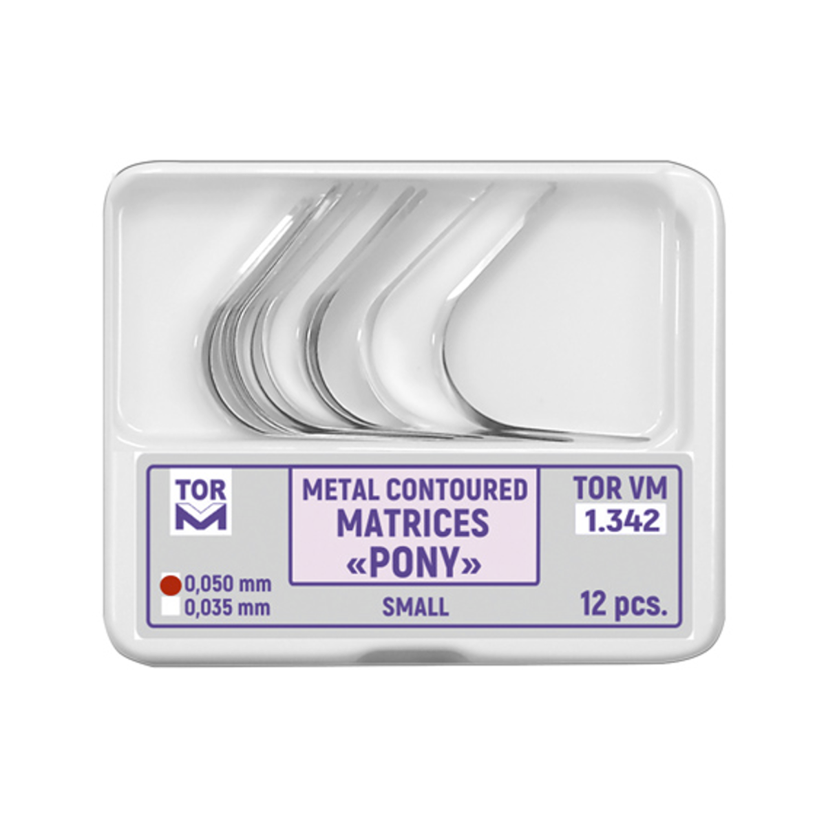 A domborított fém pony matricák matricák 50 mikron vastagságú kicsi, hosszított szekcionált matrica variációk 12 darabos kiszerelésben. Hosszabb szélük miatt a tartógyűrű vagy csipesz nem a fogközben, hanem a fog közepén tartja meg őket. A kicsi méretet kis premolárisokhoz, nagyobb tejfogakhoz ajánljuk. A hosszított szekcionált matrica variáns segítségével akár a csücsökhiányokat is pótolni tudja, mivel a rögzítő csipesz vagy gyűrű nem a fogközben helyezkedik el, így nem nyomja be a matricát sem. A domborítás miatt erős kontaktpontot alakíthatunk ki. Szélesebb fogközökben is sikerrel használható feszes kontaktpont kialakítására.