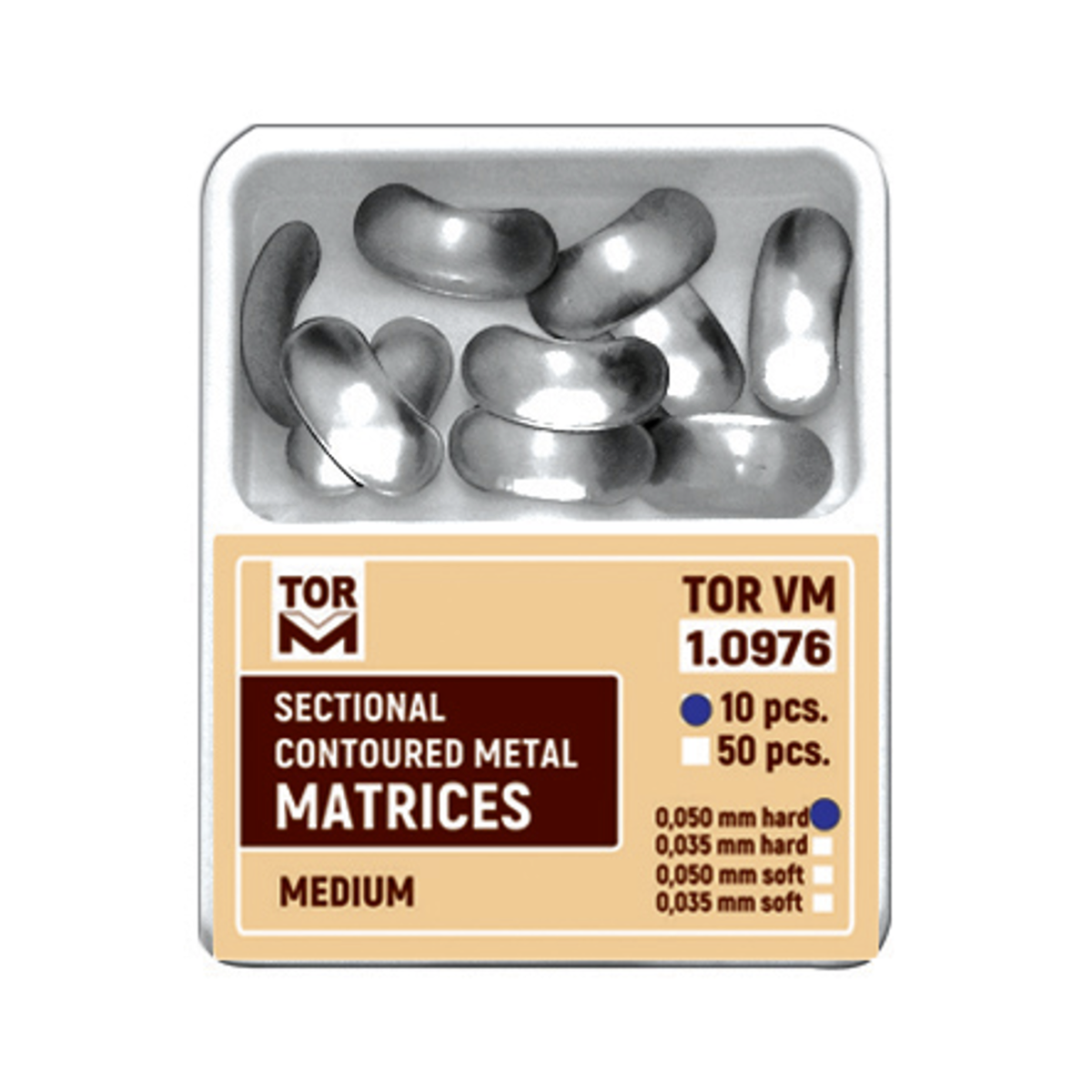 Szekcionált domborított közepes méretű fémmatrica 35 mikronos, gingivális kiterjesztéssel 50 darabos kiszerelésben. A szekcionált matricák anatómikus formája kiemelkedő kontaktpont formázást tesz lehetővé. A matricák különlegesen rugalmas anyaga többszöri használatot biztosít.