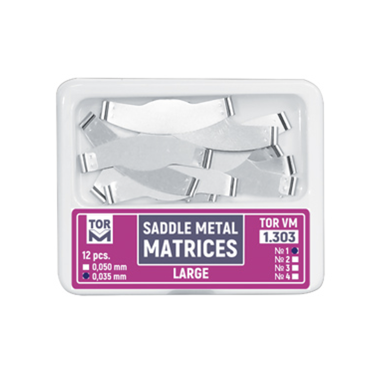 Utántöltő: No. 1 50 mikronos, nem domborított, gingivális kiterjesztéssel, nagy méretben 12 darabos kiszerelésben. a speciális fémmatrica végein függőleges fémhüvely található, melybe a speciálisszorítókapocs beilleszthető.  A rendszert gyors és egyszerű rögzíthetőség jellemzi.