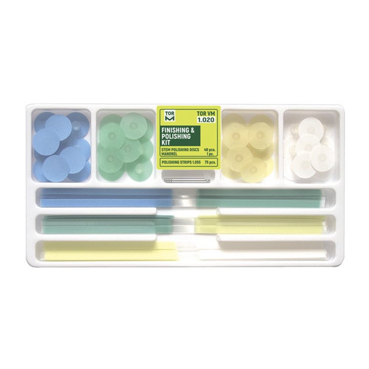 Kombinált polírozókészlet, intro kit. Polírizó korong  (48 db) szalag 75 db + 1 db mandrell, melyben az összes elemet megtalálja. A korongokkal a felszíneket, a szalagokkal az approximális területeket finírozhatja, polírozhatja.